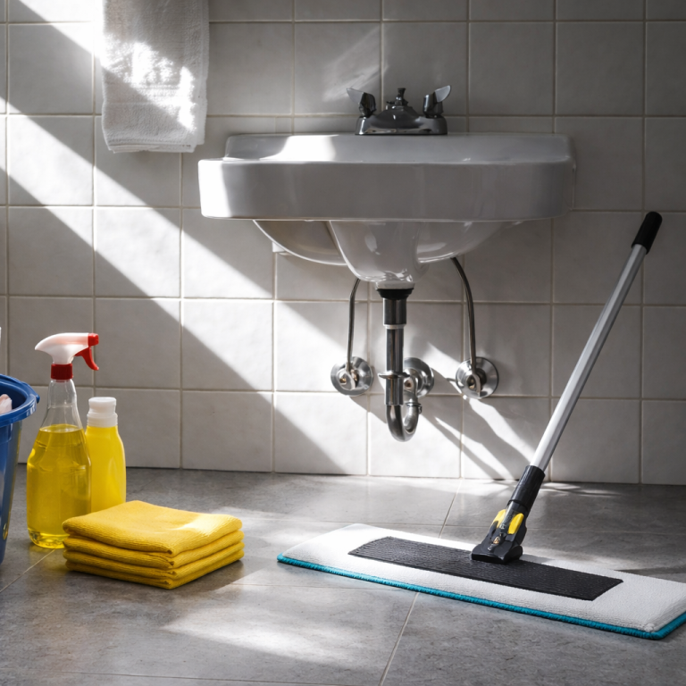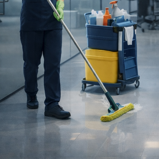 Gründliche Reinigung von Arbeitsflächen, Böden, Sanitäranlagen und Gemeinschaftsbereichen in Büros.